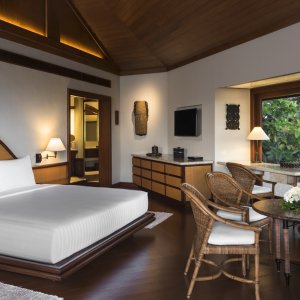 The resort’s 40 casitas (cottages in hillside and beachfront settings) are modelled after the Philippine bahay kubo (native dwelling). Inside, decorative details pay homage to neighboring islands: pebble-washed walls, coconut-shell tables, rustic Palawan rice and knife baskets, a king-size bed with a rattan headboard and sliding-glass doors that reveal outdoor decks with his-and-her divans. Nearly half the space in a casita is given over to a Cebu-marble bathroom, with twin vanities, separate changing areas, a shower and an elegant bathtub. Aman Villas - For guests in need of something even more exclusive, there are two private villas on the island.
