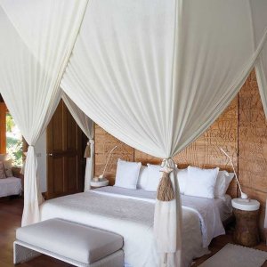 Rattan chairs and swinging daybeds fashioned by master weavers are among the furnishings showcased by this exquisite resort owned by soccer star turned furniture maven Bobby Dekeyser. Open showers in the center of the bathroom are lined with beautiful local tiles and surrounded by white beach pebbles; doors and walls are made from recycled wood turned into lattice; and local-wood headboards are whimsically carved with coconut trees and birds.Nine large and stylish thatched villas are dotted across manicured gardens within the four-acre property. Each has been built using recycled wood and features an open shower, large veranda and contemporary interiors.