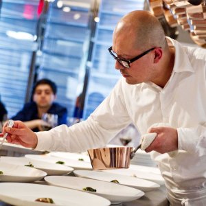 This unlikely locale, annex to the Brooklyn Fare supermarket—where the chef spends his days preparing deli-case items—also serves one luxurious, daily-changing, 15-course meal to diners perched on stools around a stainless-steel prep table each night. It’s not quite the Brooklyn Per Se, but it certainly harbors that type of ambition. There are no waiters, mood lighting, candles, music or coat check, and unless you bring your own wine (there’s no corkage fee either), you’ll only get water to drink. It’s not a restaurant, really—a dinner party’s more like it, served five nights a week in a chef’s atelier.