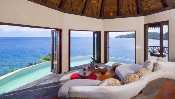 Set upon 3,500 exclusive acres Laucala private island resort is set amidst coconut plantations, sandy beaches, rich green mountains and breathtaking natural beauty. Each of 25 villas are glamorous versions of traditional Fijian dwellings. This self-sustaining paradise produces its own livestock and vegetables, and owes most of its products and structures to the island's resources. Laucala Island maintains a fleet of 14 boats for guests to explore the pristine 18-mile-long coral reef that protects it. You cand enjoy diving in a unique underwater world, rain forest tours, horseback riding, yachting, golfing on the 18-hole championship course, or meeting native artists.