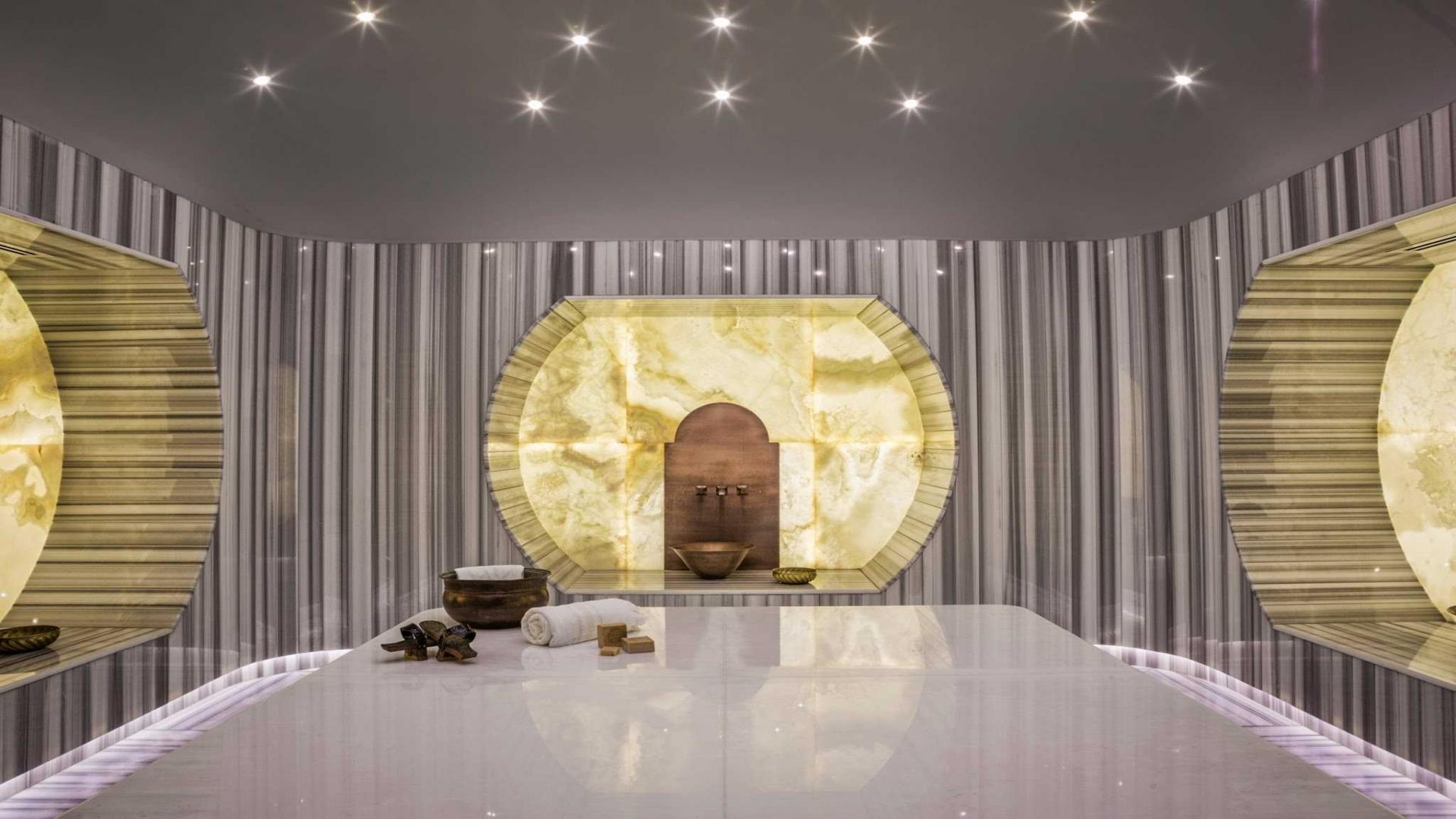 Another world away from Istanbul’s vibrant streets, the 950-square-meter Iridium Spa serves as a seductive urban escape at the St Regis Istanbul hotel. Beige marble walls and mosaics combine with metallic and walnut accents, while ornate curtain-like metallic screens promote privacy. The alluring atmosphere extends to seven treatment rooms, including a VIP room with a Vichy shower and attached private hammam, a couple’s room, and a Thai-themed room. Meanwhile, the spa’s treatment menu comprises facials, body treatments, massages, and ample beauty services. Before or after their therapies, you are invited to access the spa’s two hammams and three treatment pools.