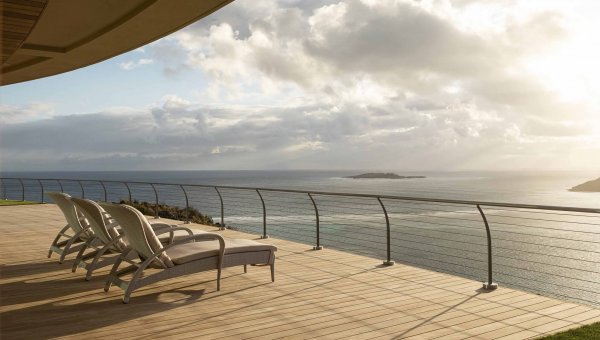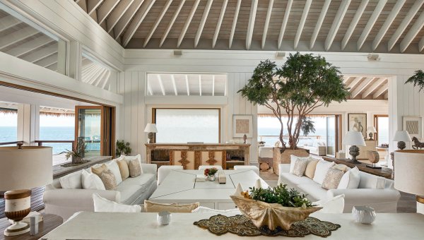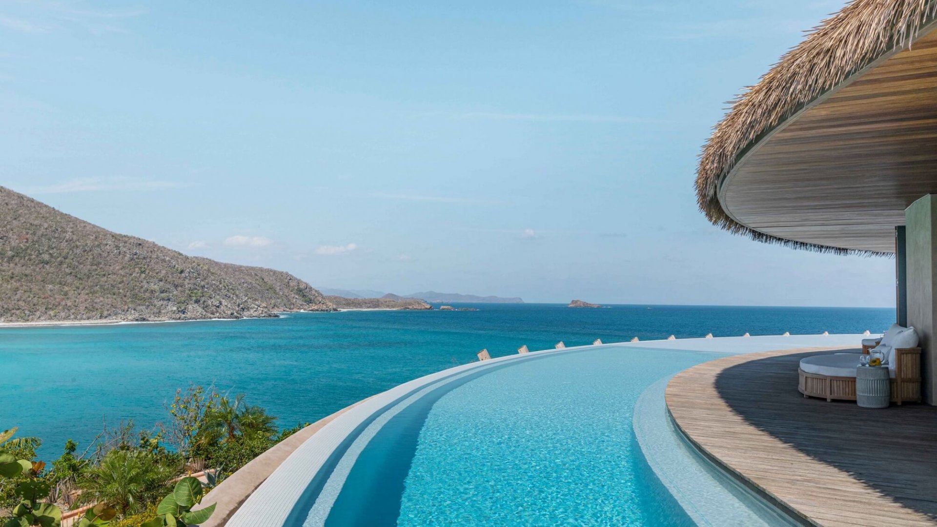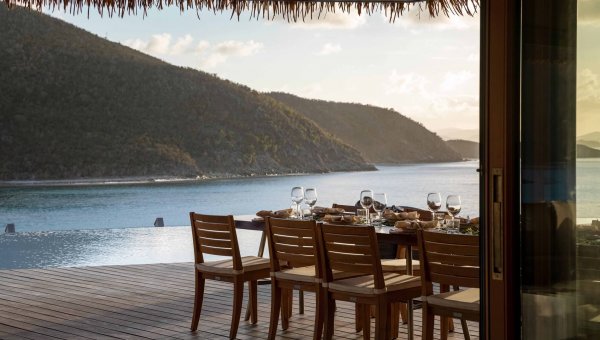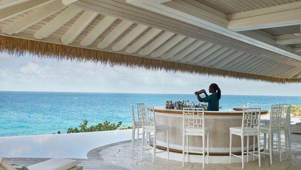 The expansive communal area of the main house brings the estate together as a dining and entertainment space, with a contemporary kitchen and bar and a huge infinity-edge pool offering 180-degree views of the surrounding turquoise waters.