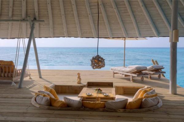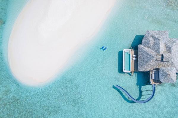 The villa is a playground for the senses—featuring a private saltwater pool that blends seamlessly with the ocean, a sleek curved slide that plunges straight into the crystal-clear lagoon, and a retractable roof over the master bedroom for stargazing like never before. An open-air dining deck invites guests to indulge in world-class cuisine while the upstairs spa treatment room elevates relaxation to an art form. Every inch of Castaway reflects Soneva’s commitment to sustainability and barefoot luxury.